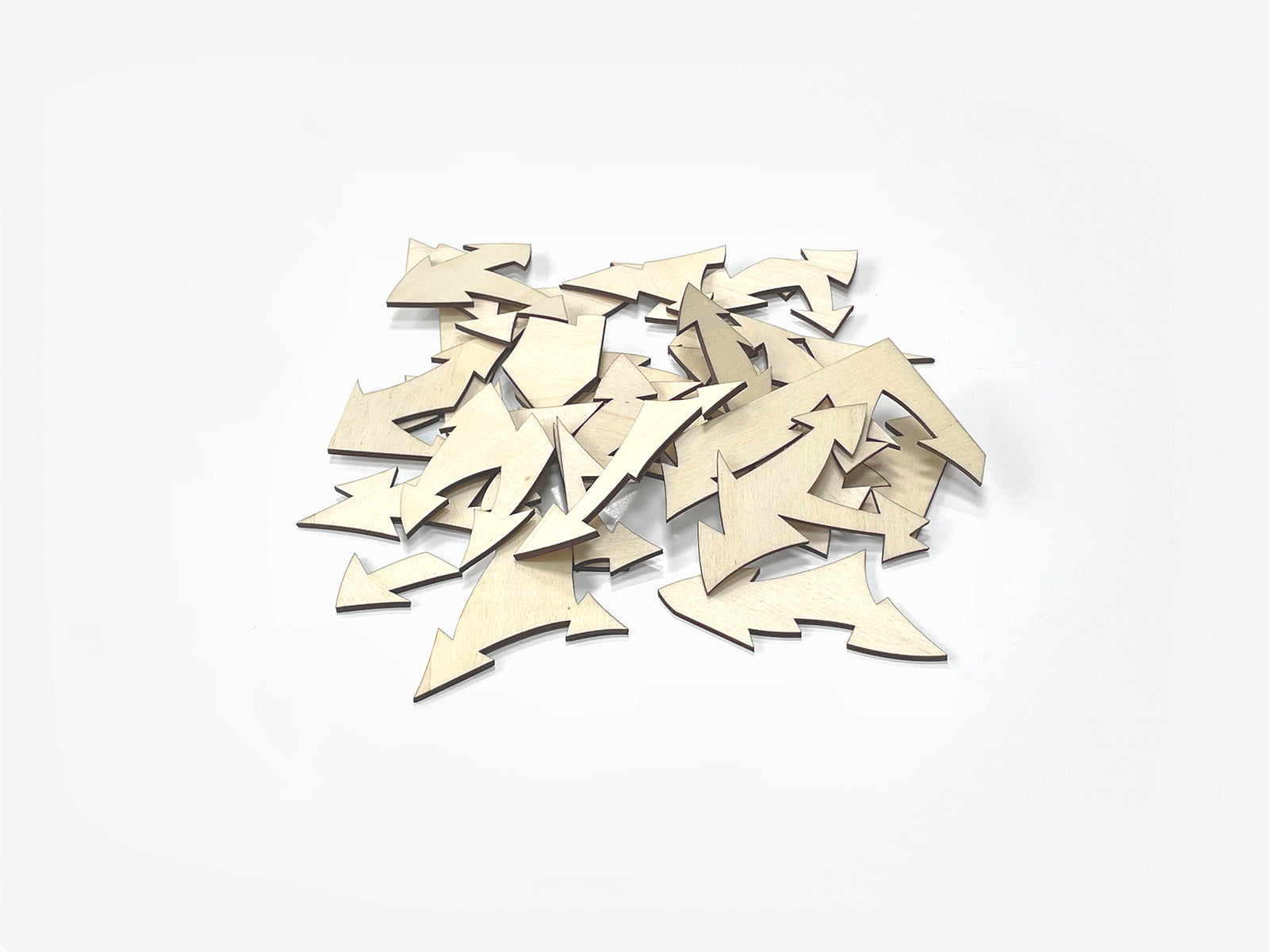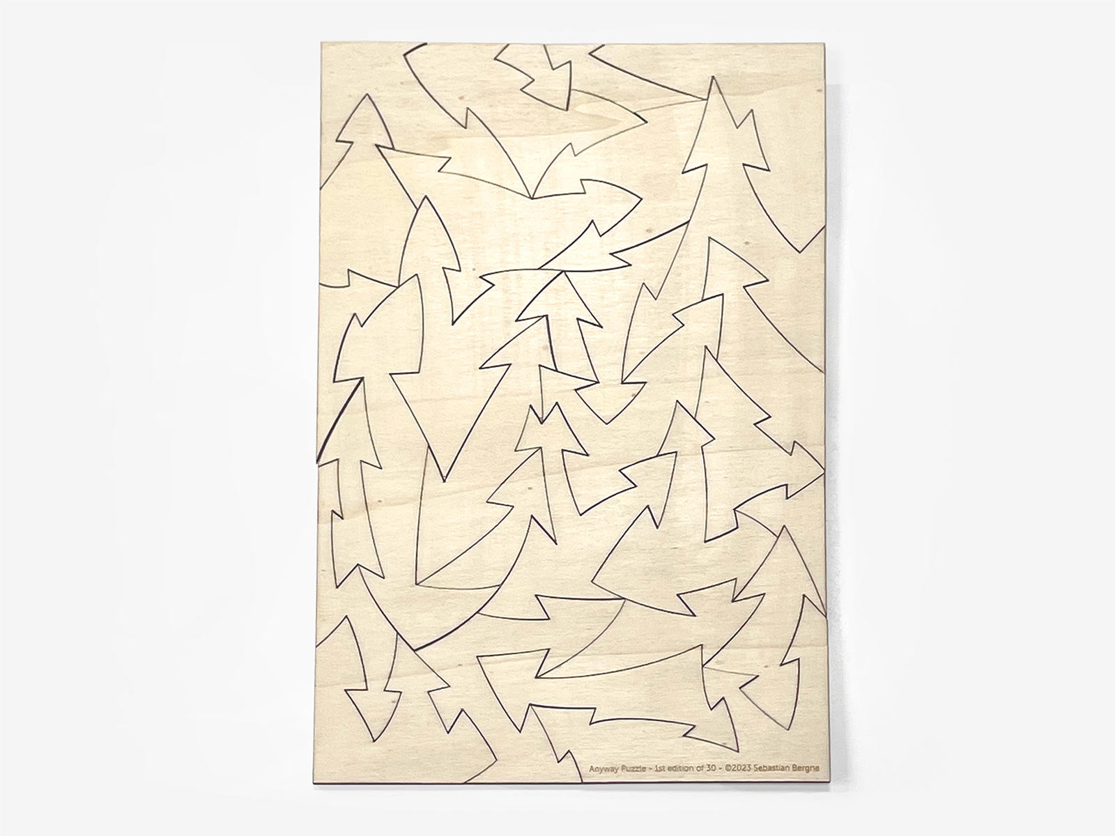 Blank wooden puzzle that replaces an applied surface image with a new hand drawn cutting design that uses interlocking arrow motifs.