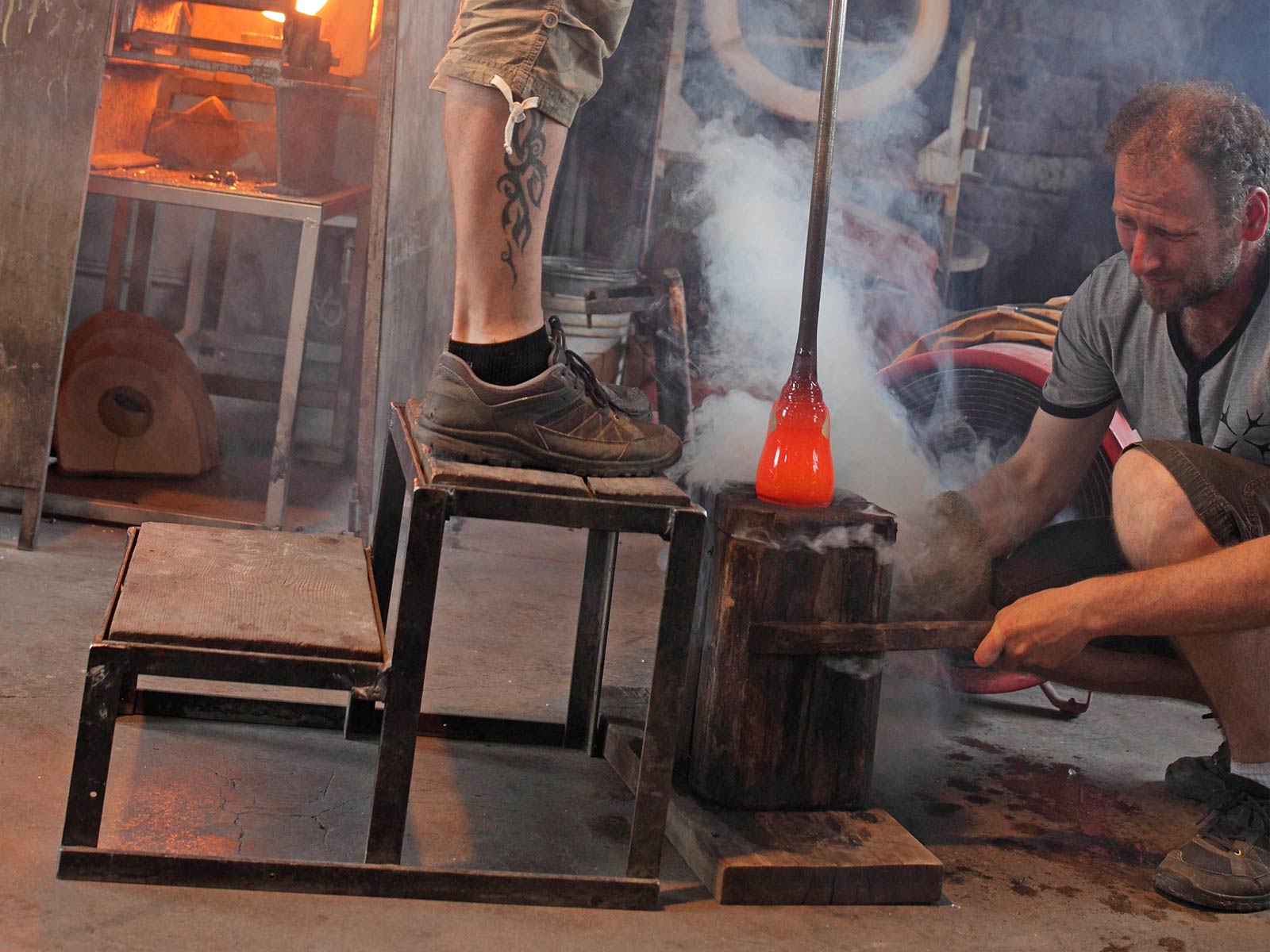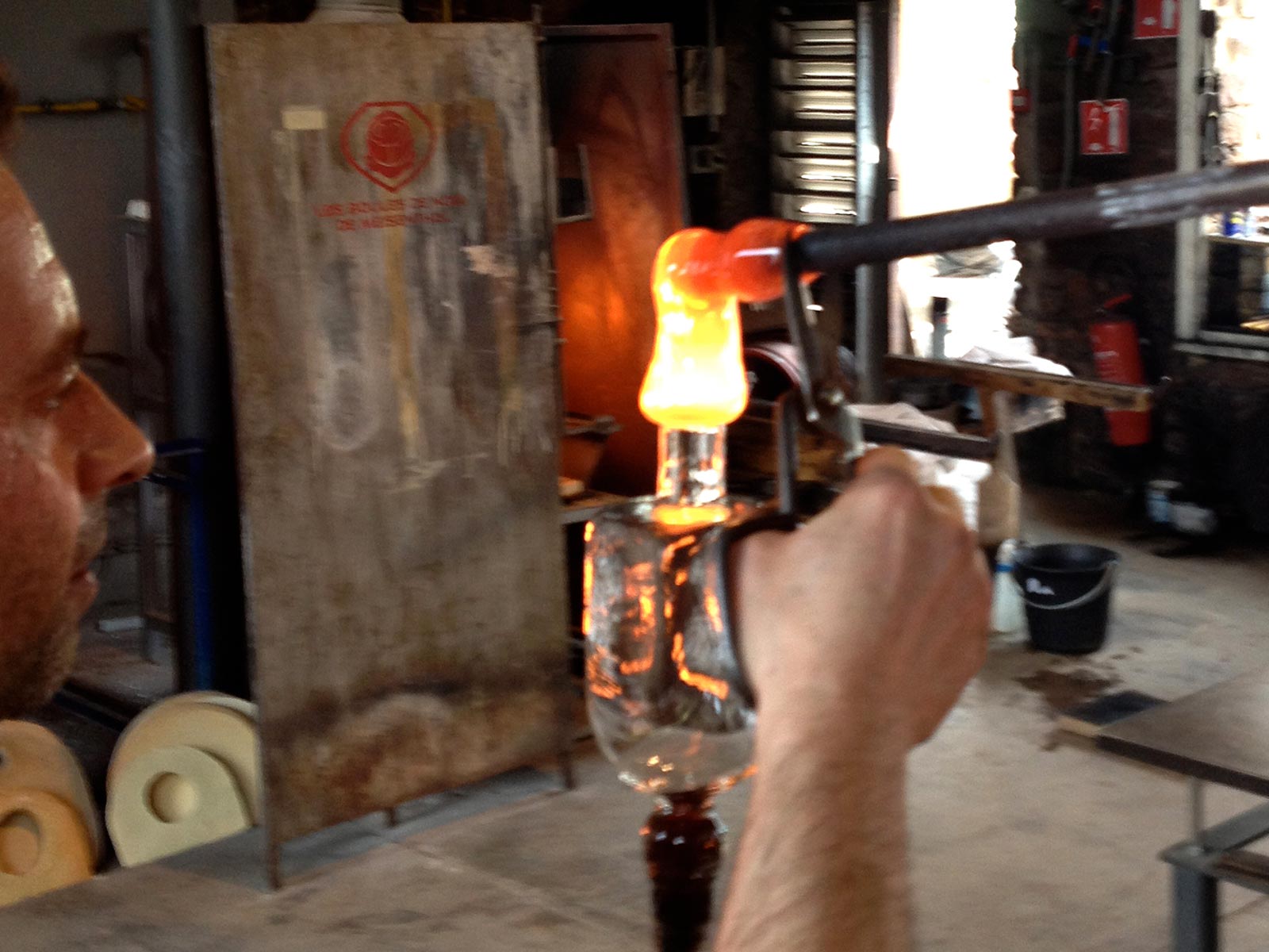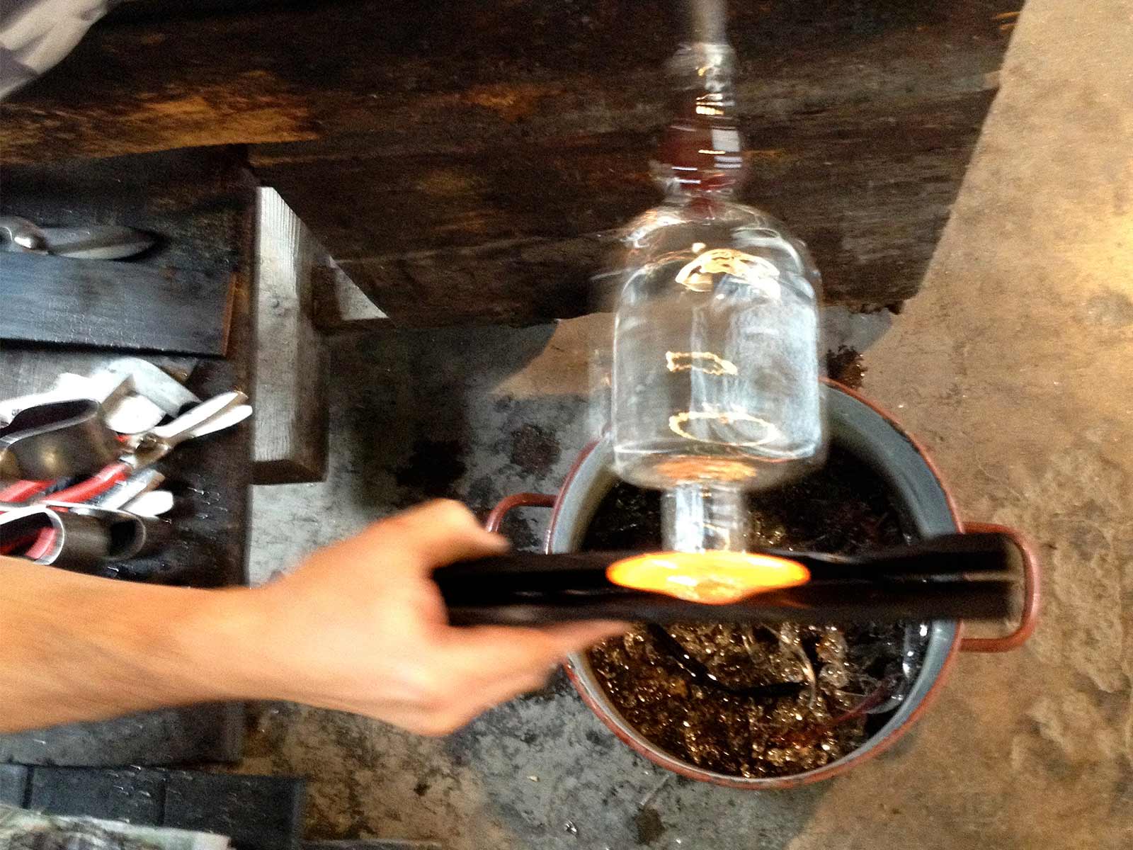 Each glass is crafted using a combination of traditional techniques. The upper part re-uses an existing bottle mould from their extensive library and the base is added using traditional hand tools. This process of reinterpreting previous forms and techniques is part of a working method that often leads to innovative outcomes.