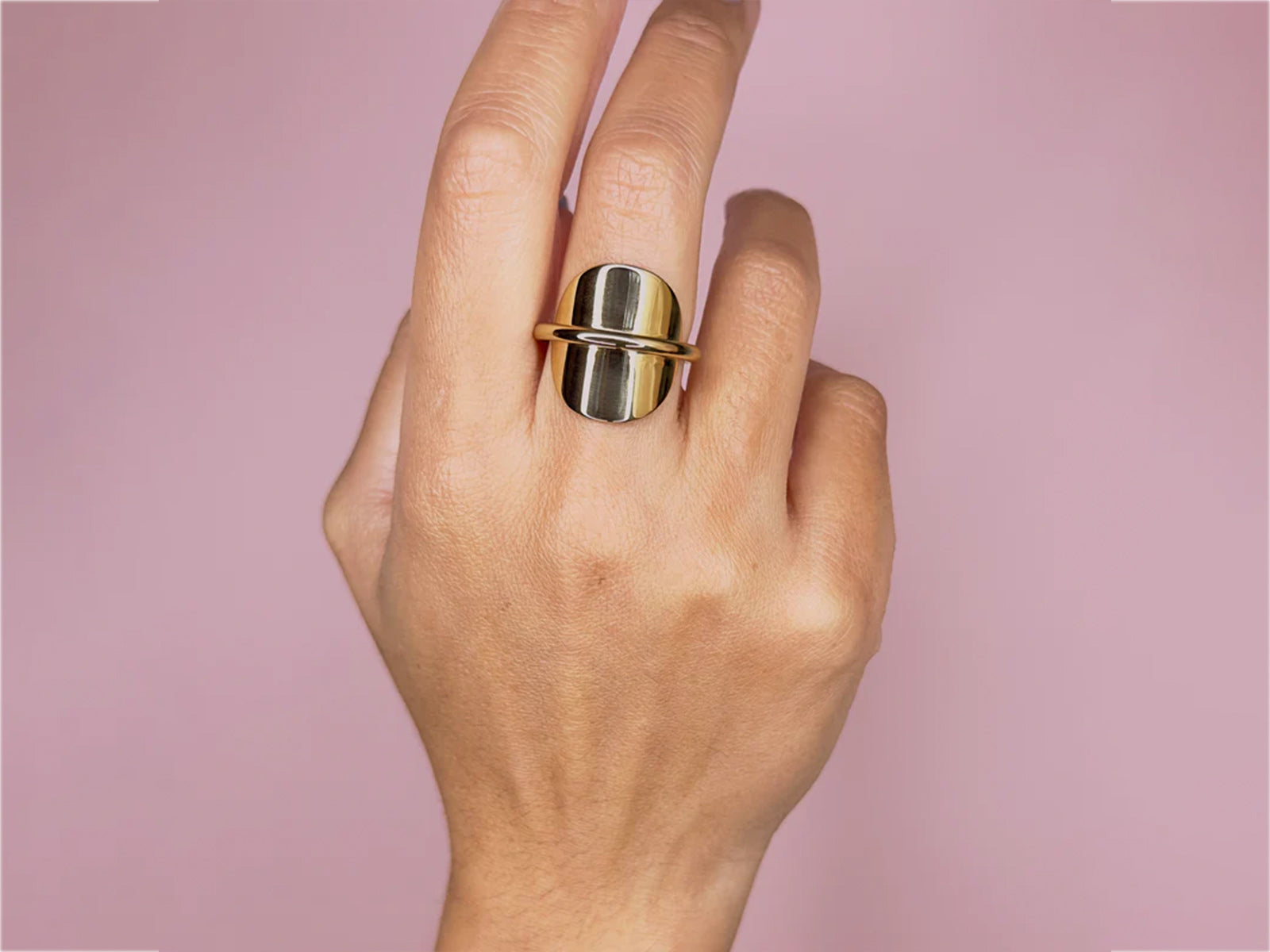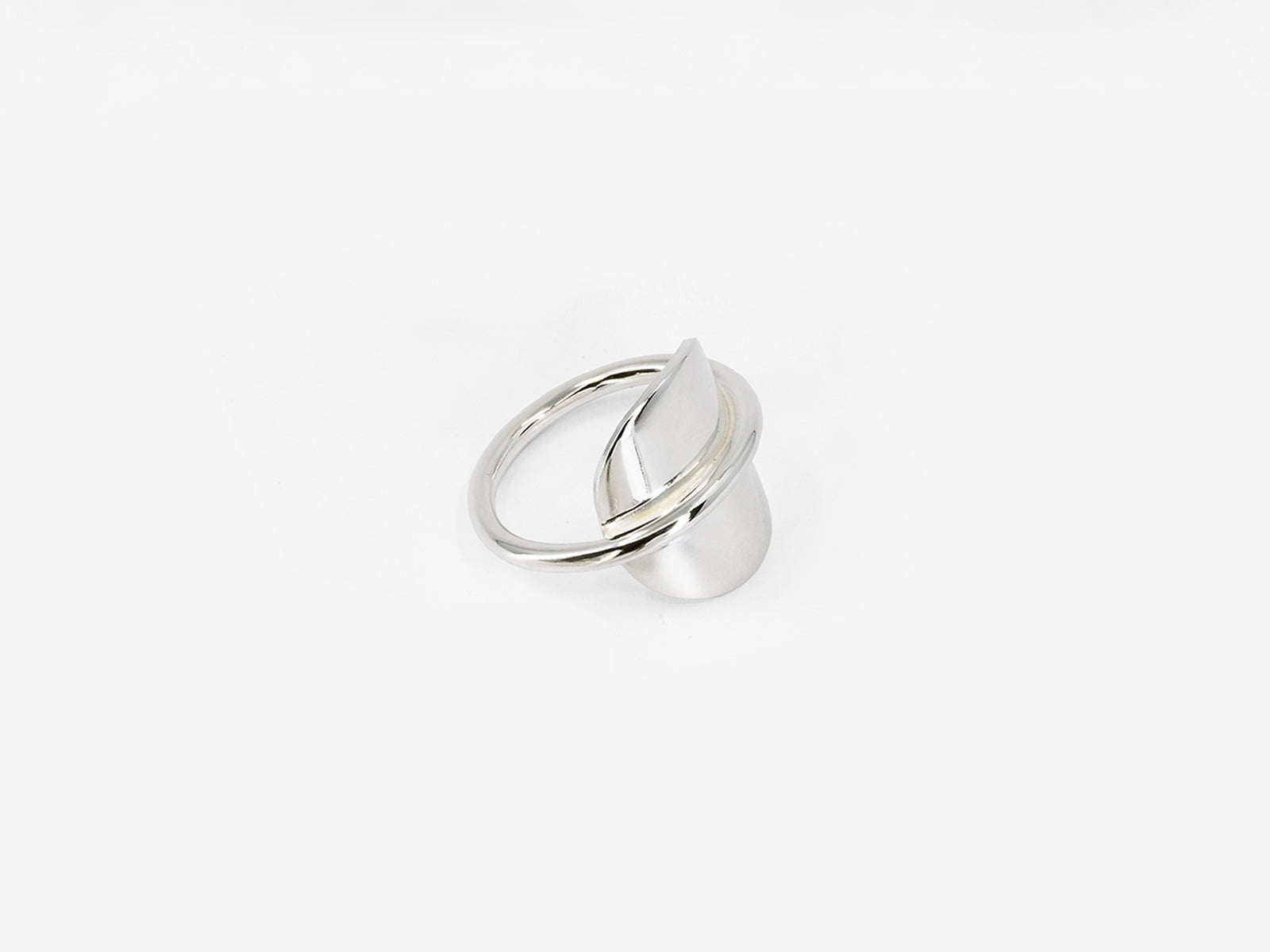A polished coin that is cut, curved or folded and then combined with the simplest of rings.