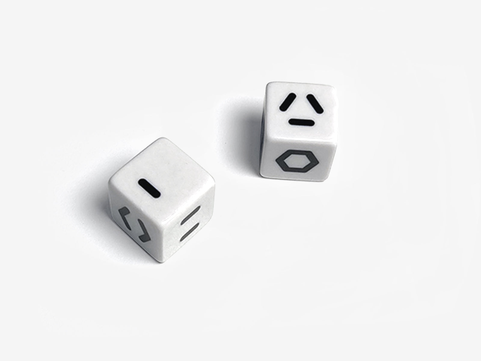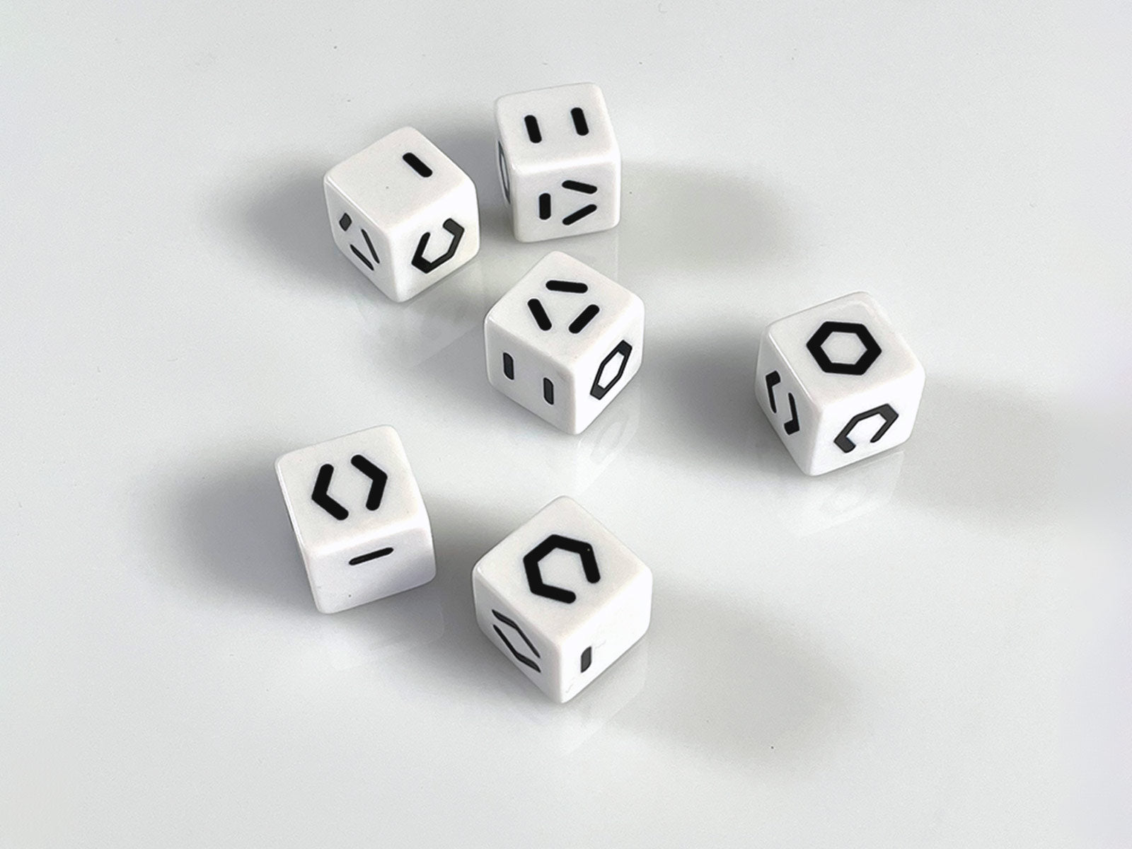 Hexa Dice are part of a series of dice works designed and produced by Sebastian Bergne during 2022. The classic printed dot arrangements are replaced by symbols based on a six sided figure.