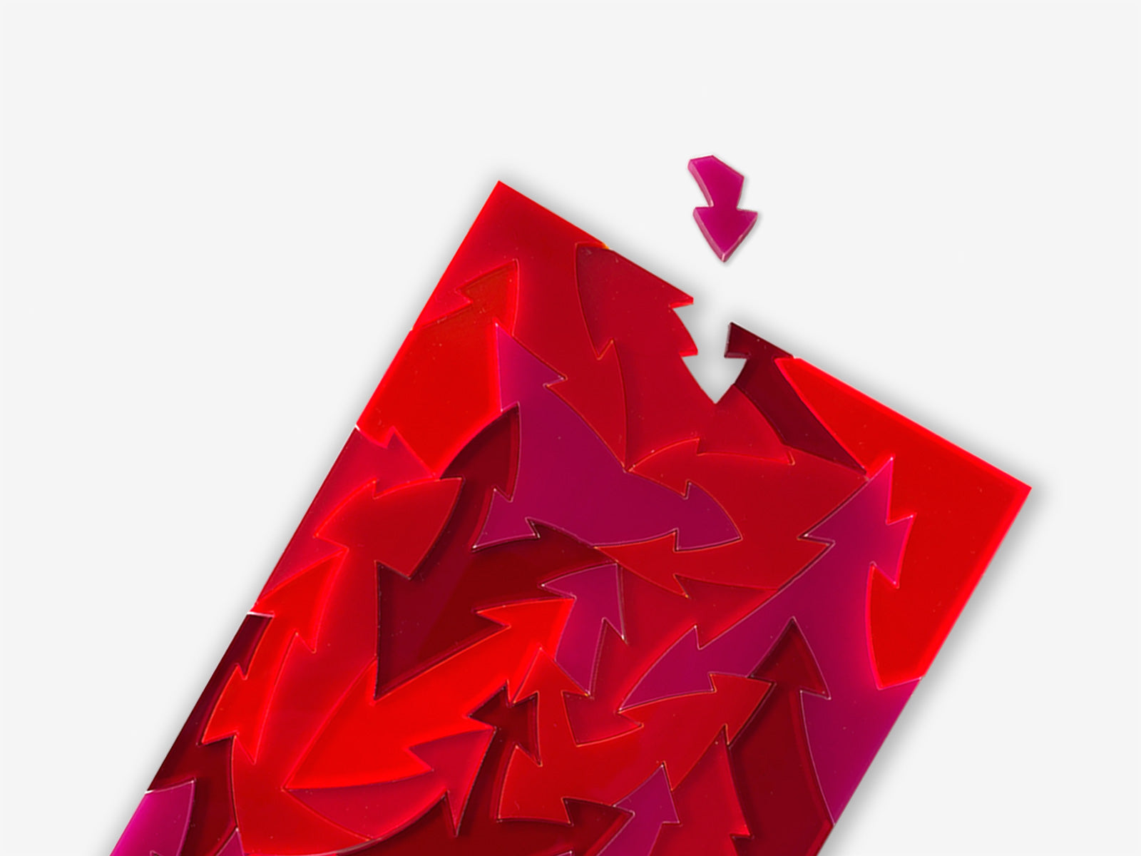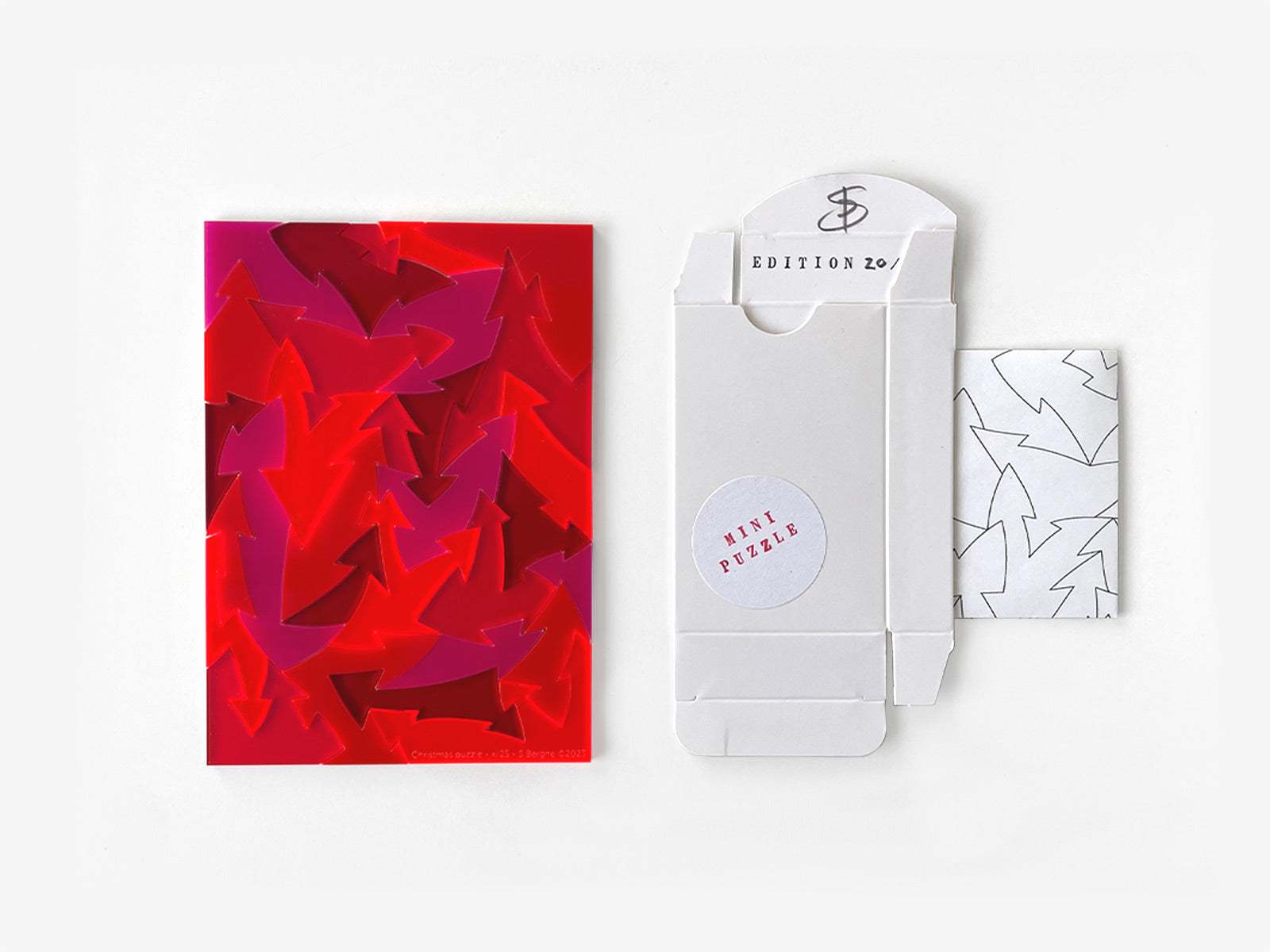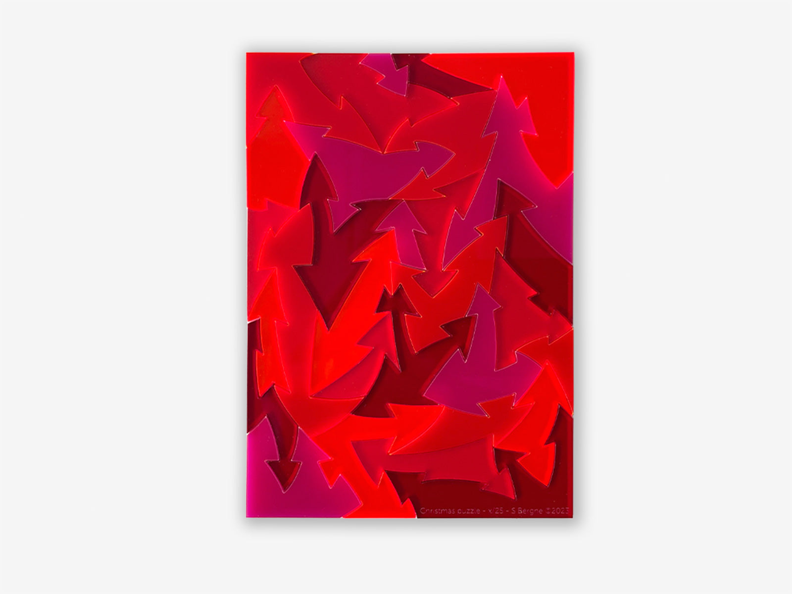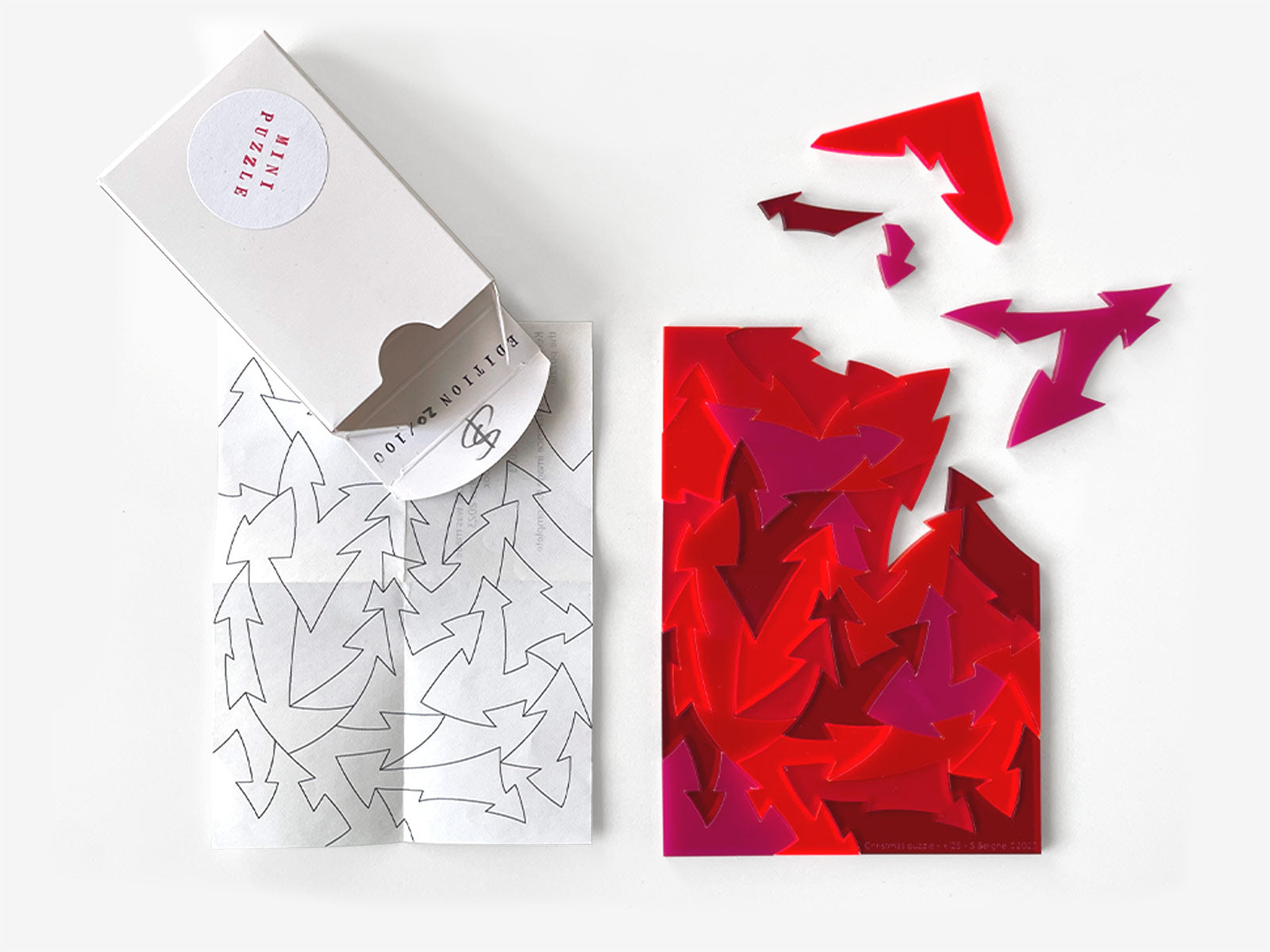 Small acrylic arrow puzzle based on the Anyway puzzle that uses an interlocking arrow design. Supplied with a small folding box and reference image for storage.