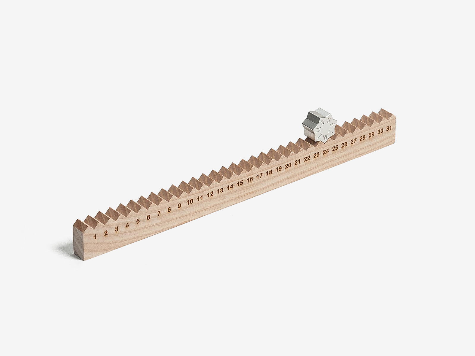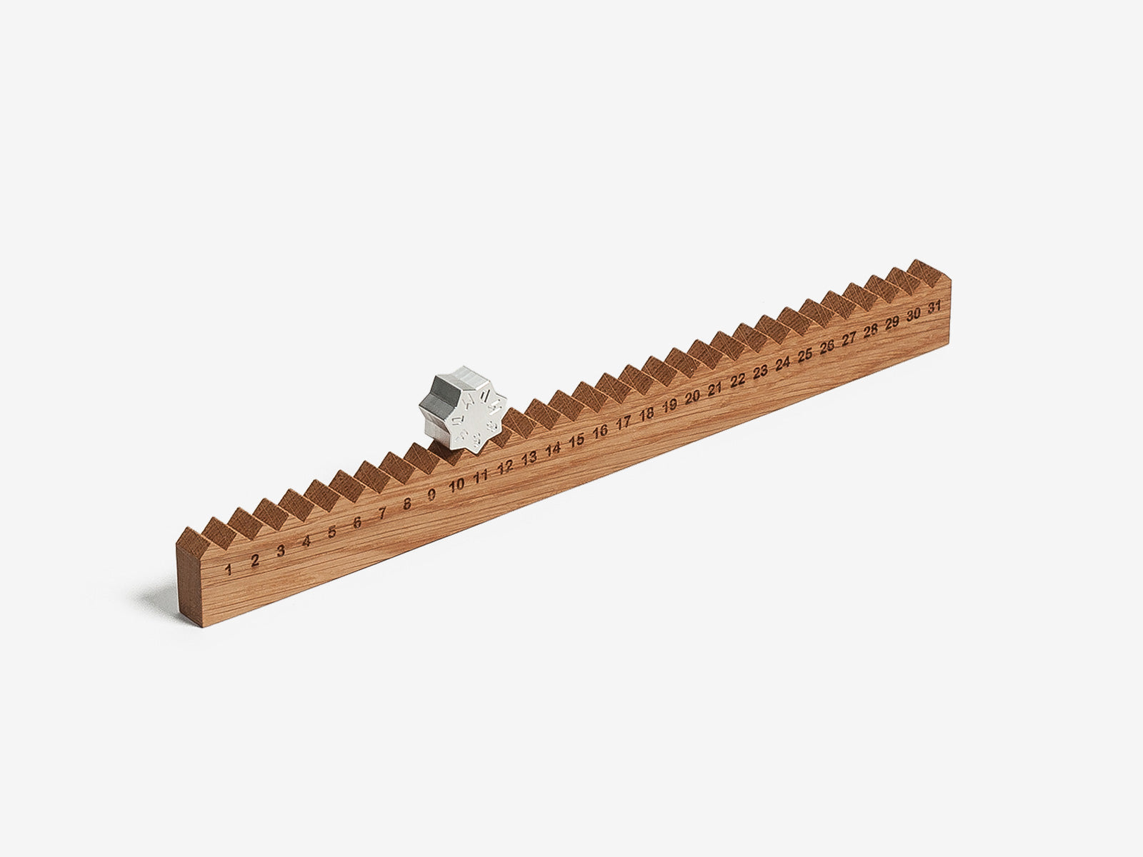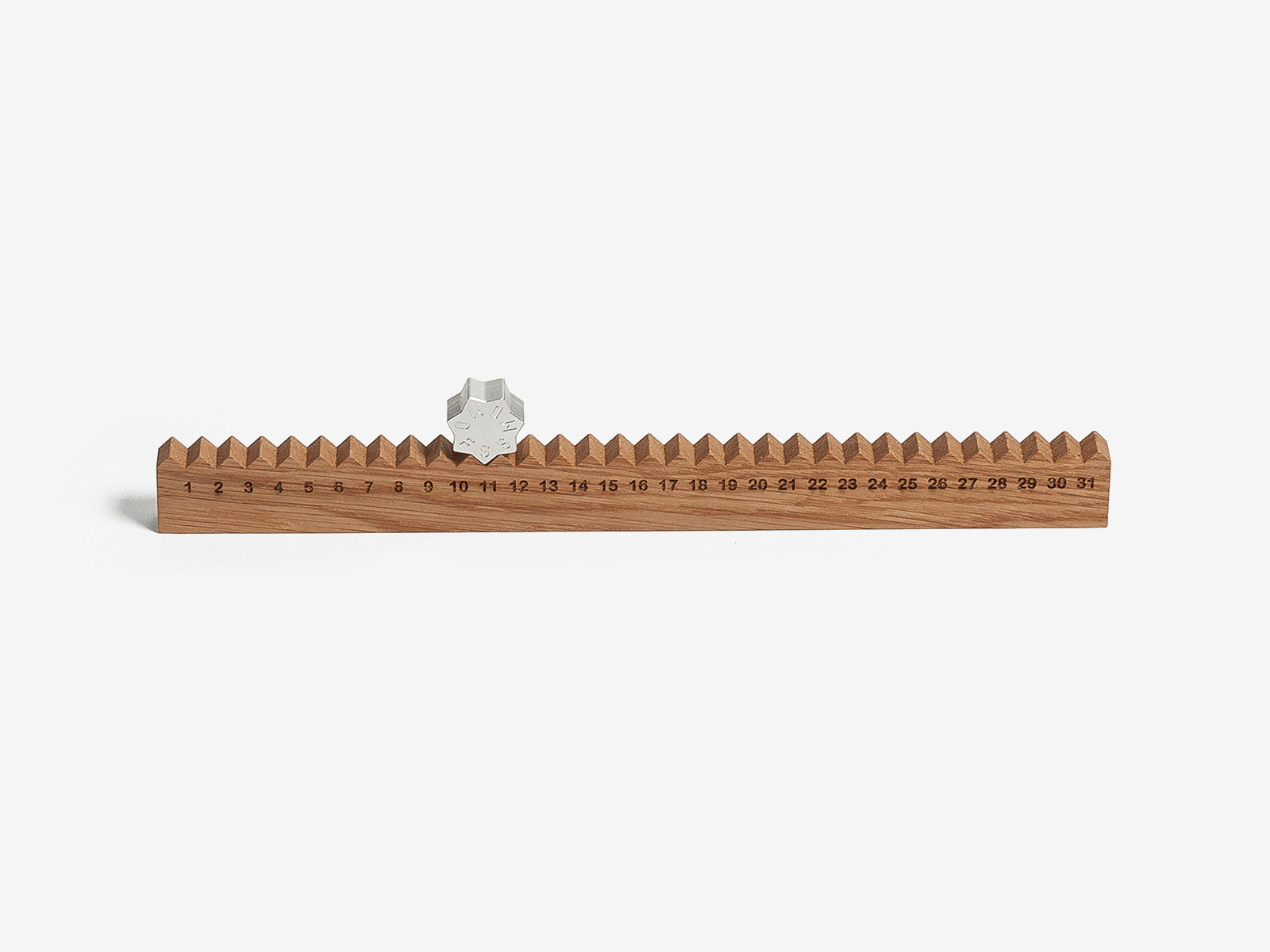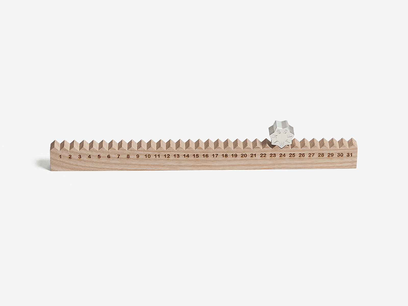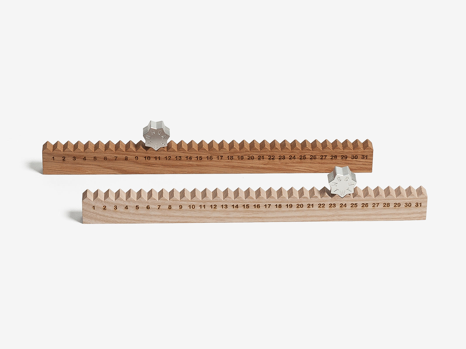 Available in oak or ash wood with machined aluminium. The star has day initials in English on one side and German on the other.