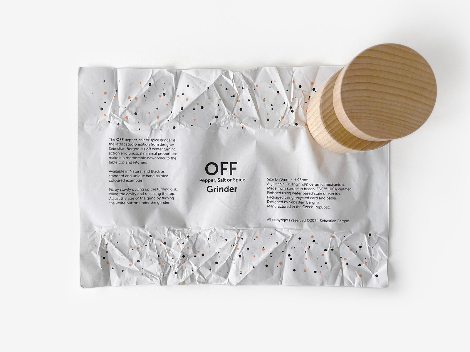 The Off pepper, salt or spice grinder is characterised by its off center turning action and unusual minimal proportions. The mill uses the well known Danish CrushGrind® ceramic mechanism making it adjustable and versatile. It is made for Sebastian Bergne using European beach, FSC™ 100% certified in the Czech Republic and is finished using water based stain or varnish.