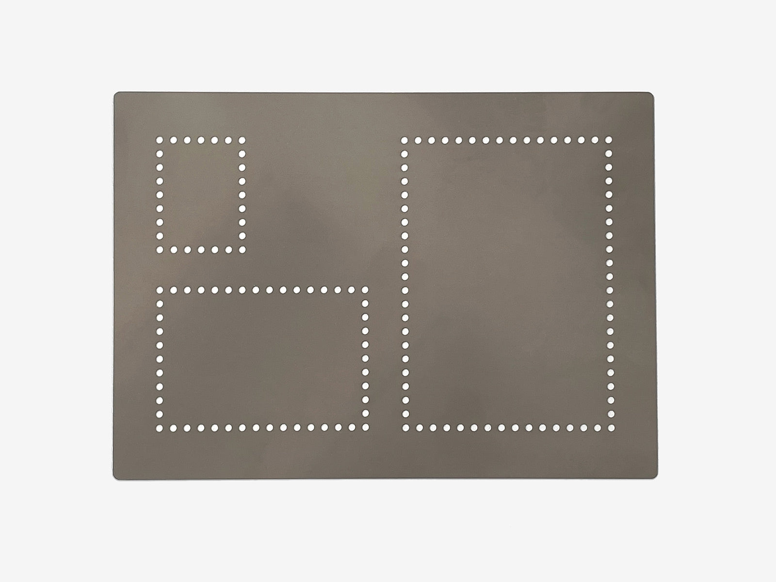 Acid etched 0.15mm thick stainless steel. Packaged in a translucent envelope.