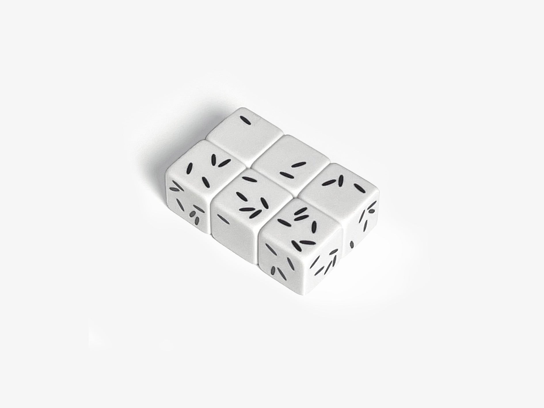 Rice Dice are part of a series of dice works designed and produced by Sebastian Bergne during 2022. The classic printed dot arrangements are replaced by rice forms distributed randomly around the surface of the cube.