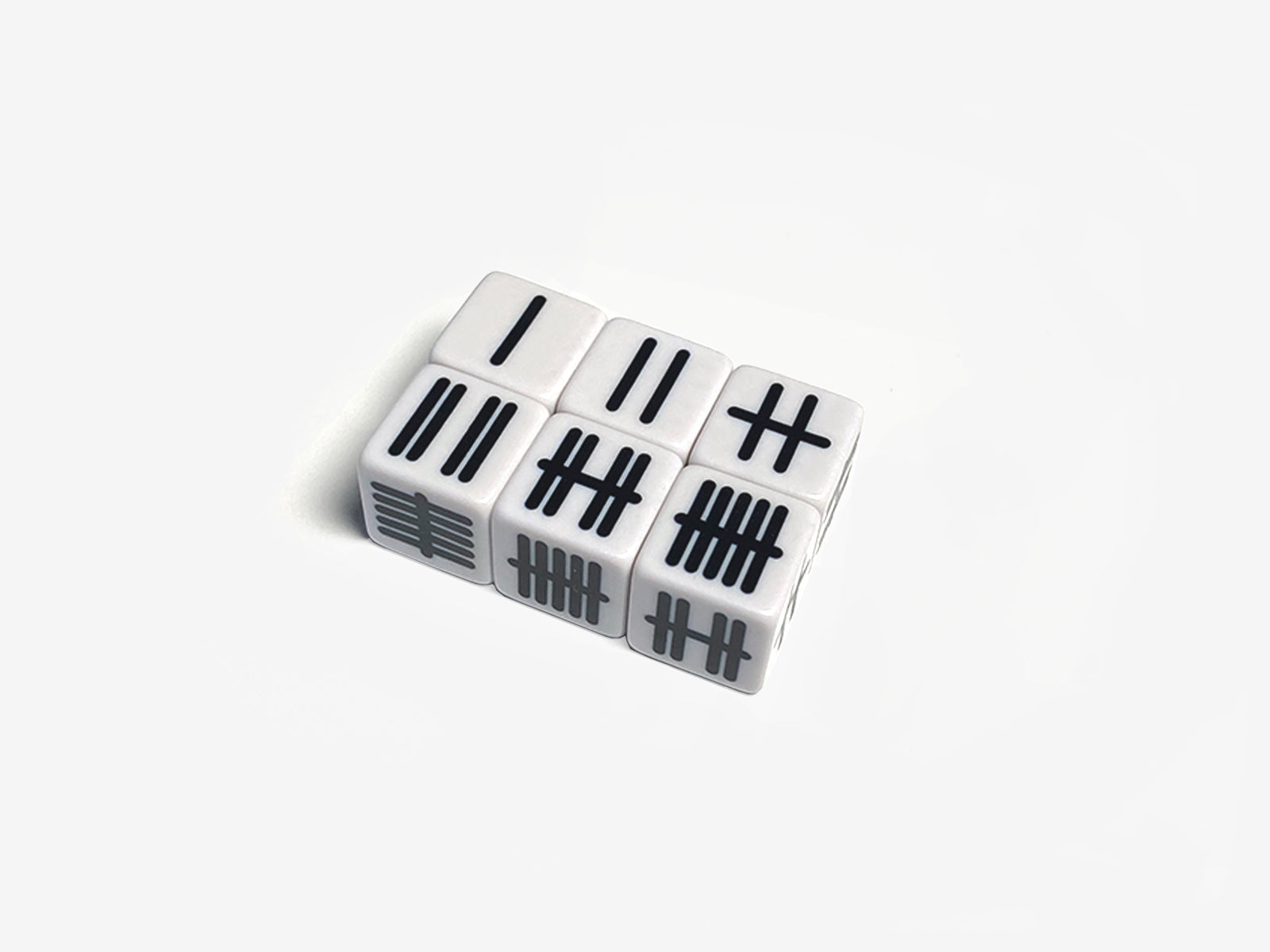 Total Dice are part of a series of dice works designed and produced by Sebastian Bergne during 2022. The classic printed dot arrangements are replaced by a system of tally type marks. The groupings of the marks in pairs is intended to make it easier to read the dice quickly.
