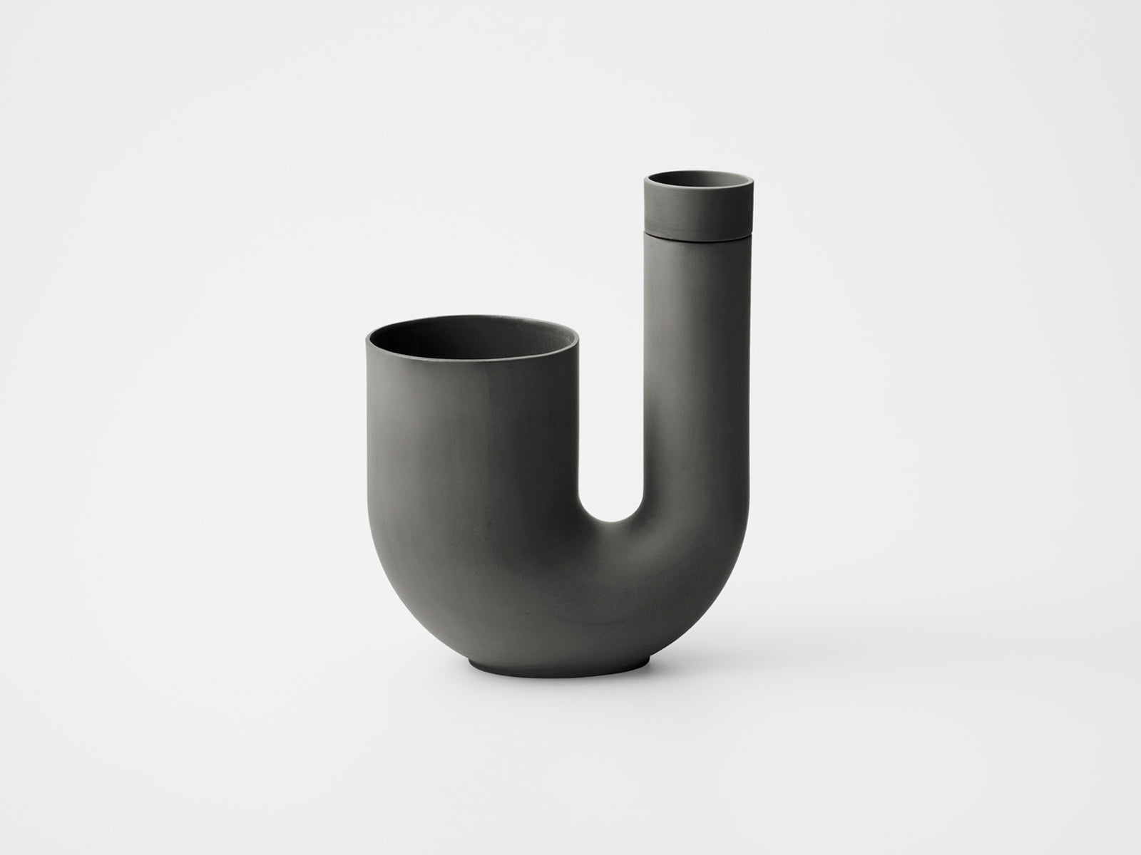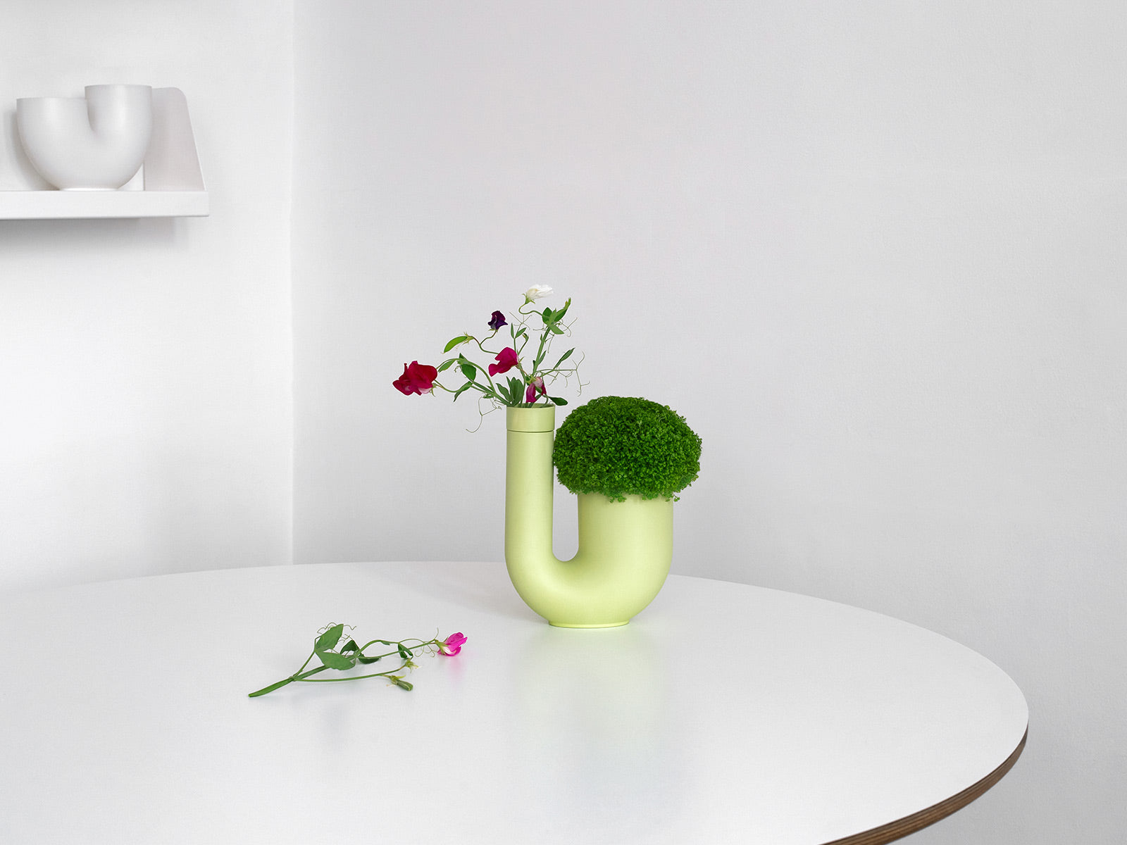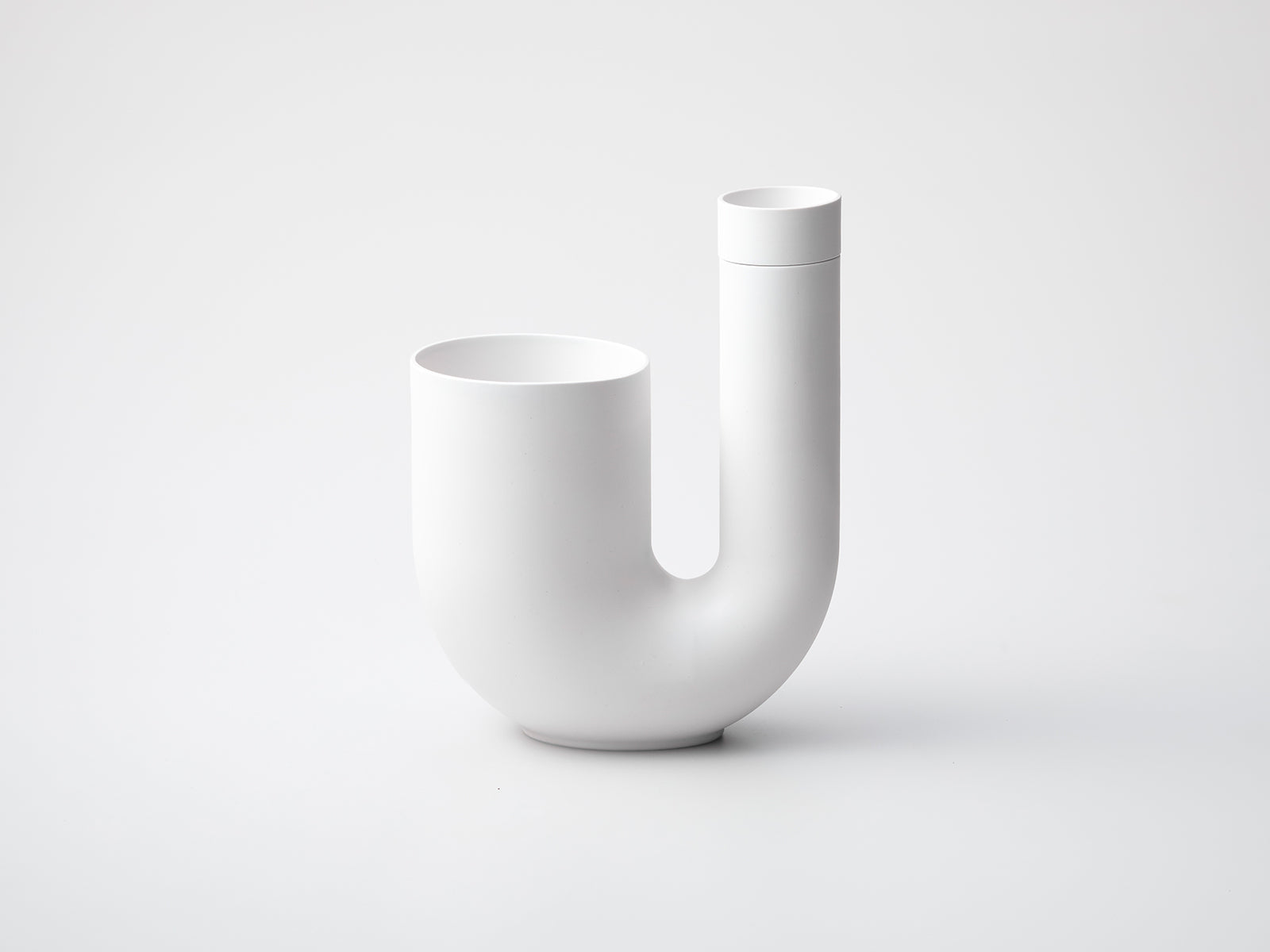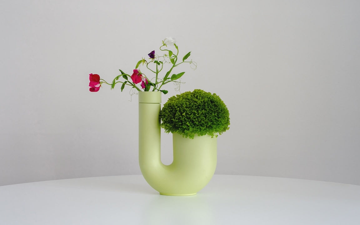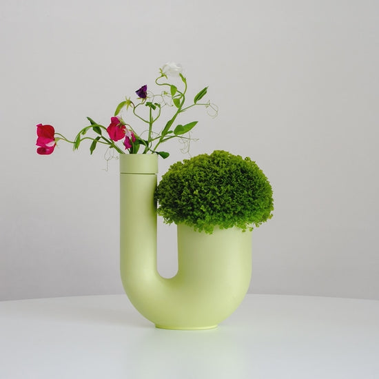 This unique domestic container combines a potted plant and cut flowers in a separate, inserted water container. Planted herbs can be brightened up with a small arrangement of cut flowers. Alternatively, the two volumes can be used to combine cut flowers in new exciting ways.